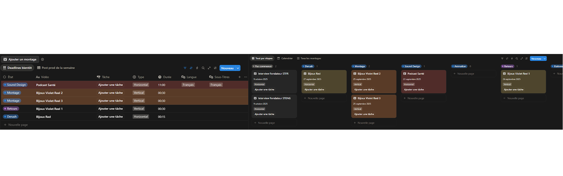 Ce template Notion tout-en-un centralise tous vos projets de montage dans un espace intuitif et visuellement optimisé. Suivez l'avancement de chaque projet, gérez vos deadlines et gardez une vue d'ensemble de votre charge de travail en un coup d'œil.